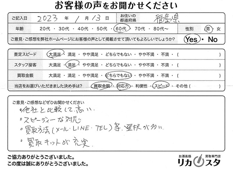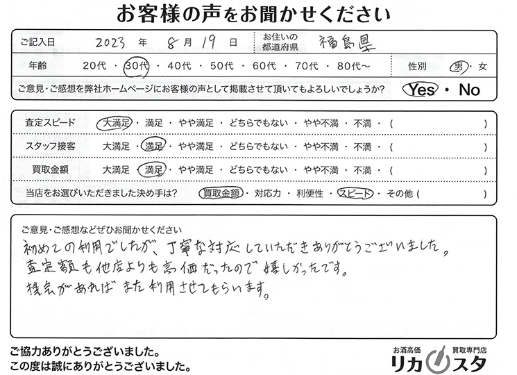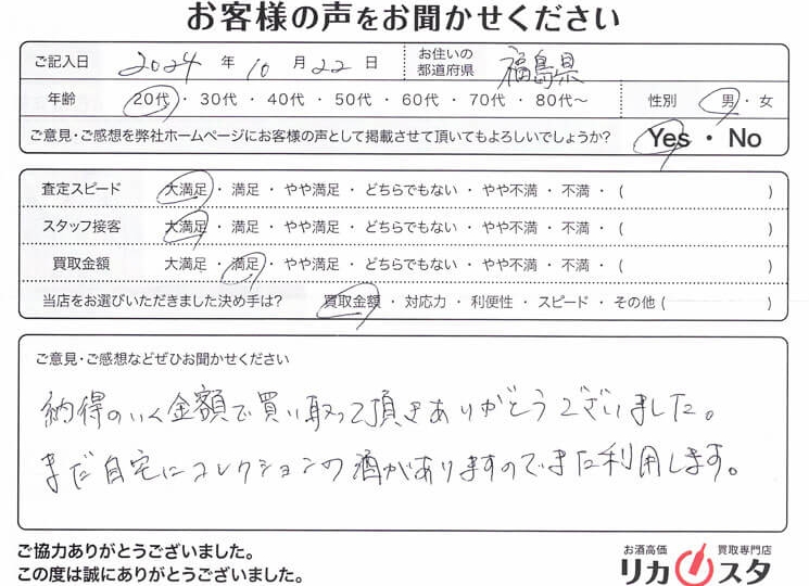 お客様コメント 納得のいく金額で買い取っていただきありがとうございました。 まだ自宅にコレクションのお酒がありますのでまた利用します。 […]
