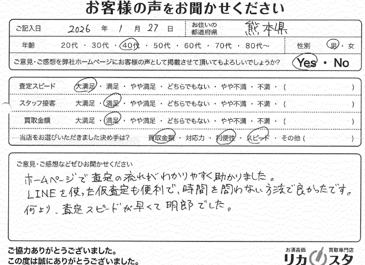お客様コメント ホームページで査定の流れがわかりやすく助かりました。LINEを使った仮査定も便利で、時間を問わない方法で良かったです。何より、査定スピードが […]