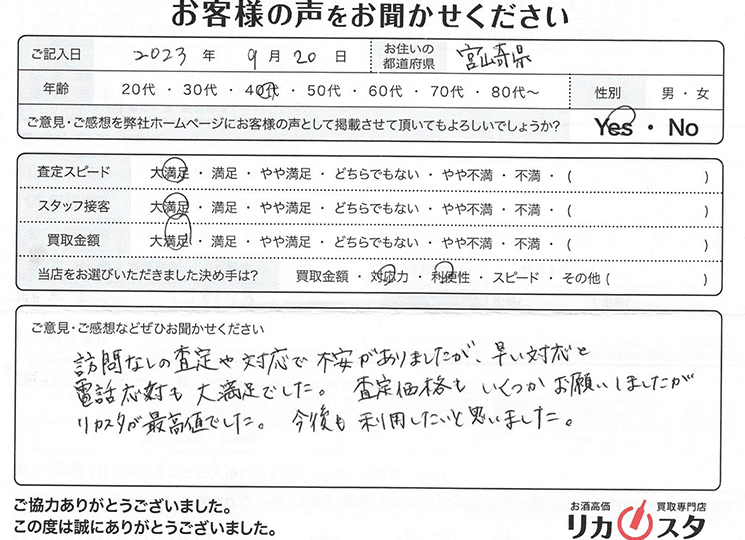 お客様コメント 訪問なしの査定や対応で不安がありましたが、早い対応と電話対応も満足でした。 査定価格もいくつかお願いしましたがリカスタが最高値でした。 今後 […]