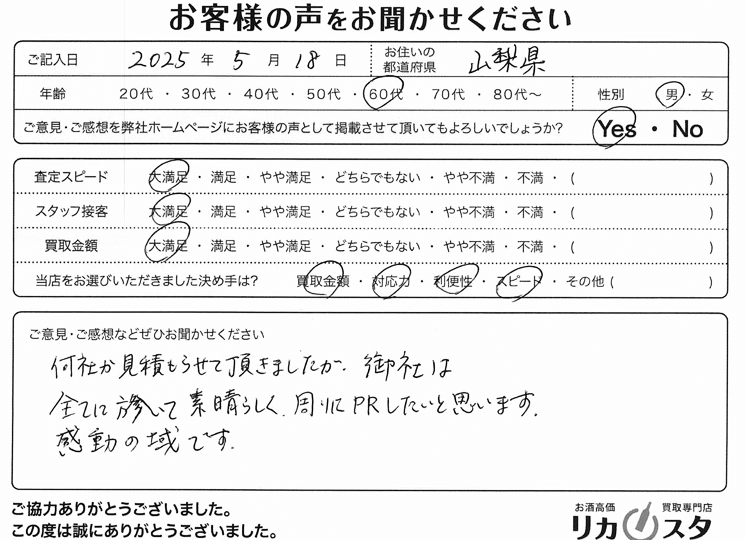 お客様コメント 査定スピードも早く、他店と比較した値段にも早々に対応してくれて、 何よりスムーズな取引ができました。 主人が好きだったお酒が飲 […]