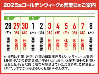 平素より格別のご愛顧賜り、厚く御礼申し上げます。 さて誠に勝手ながら、11月24日(土)は社内研修を行うため臨時休業とさせていただきます。 休業日ならびに定休日は、LINE・WEB・電話・FAXなどの査定業務、宅配・出張 […]