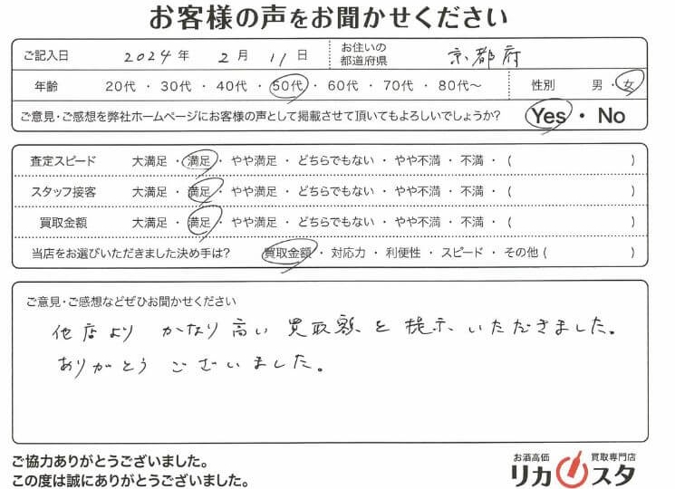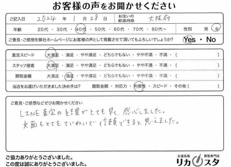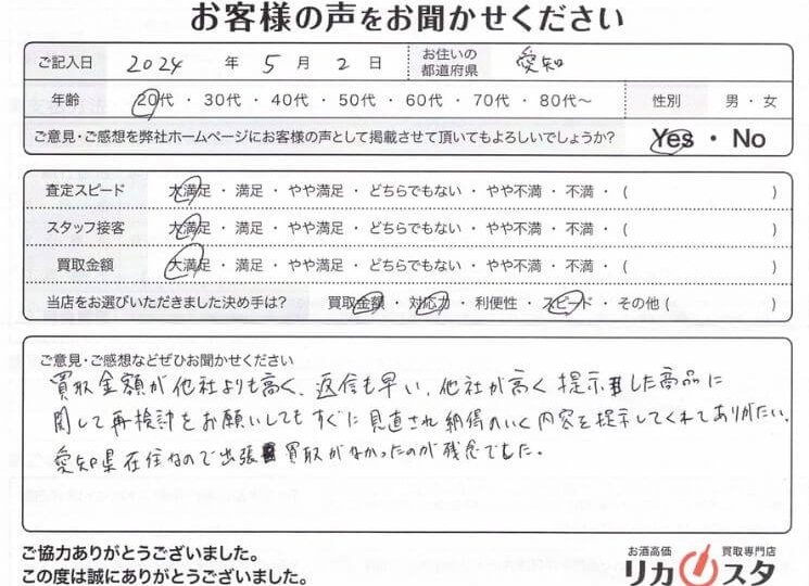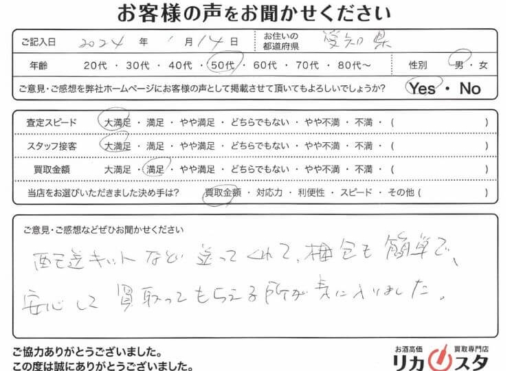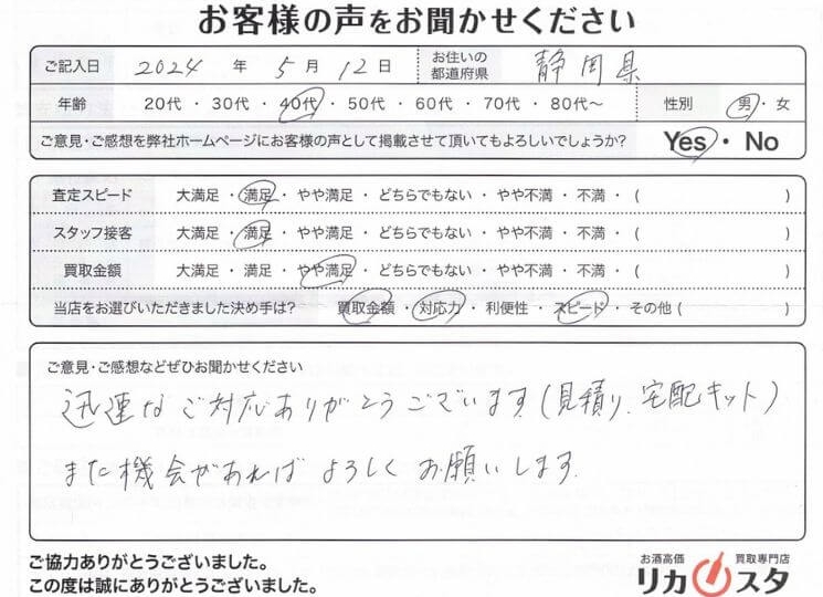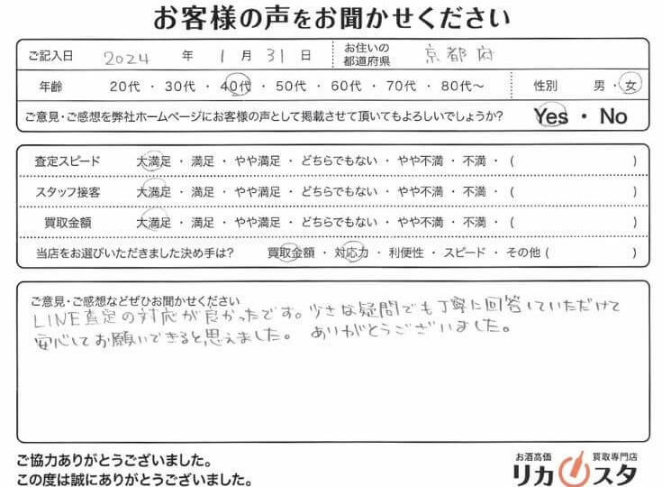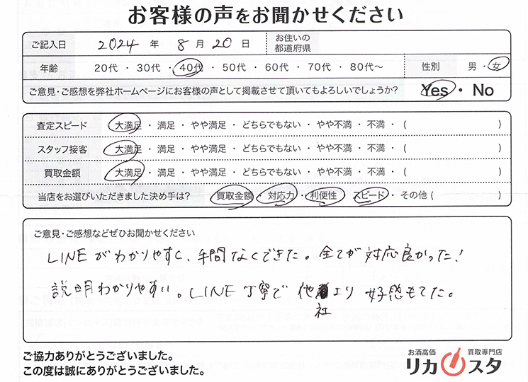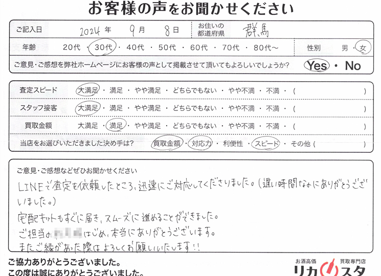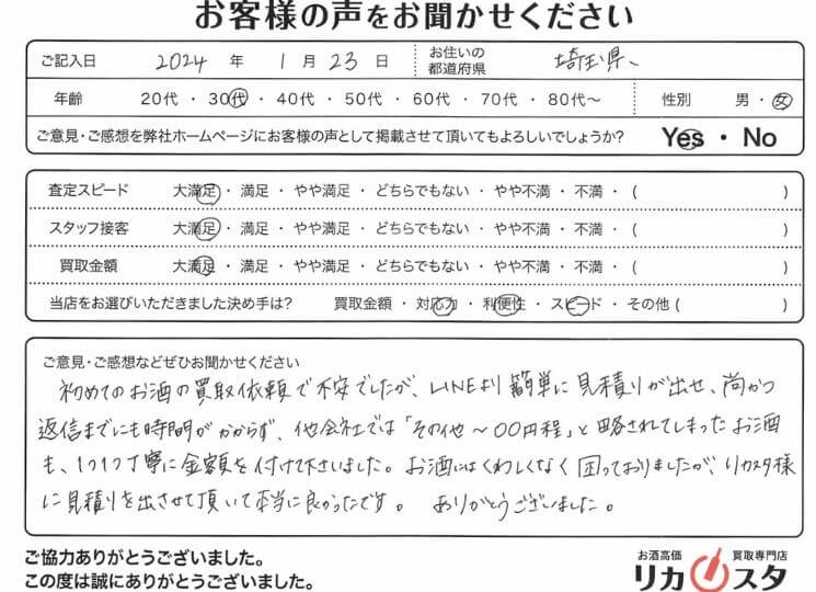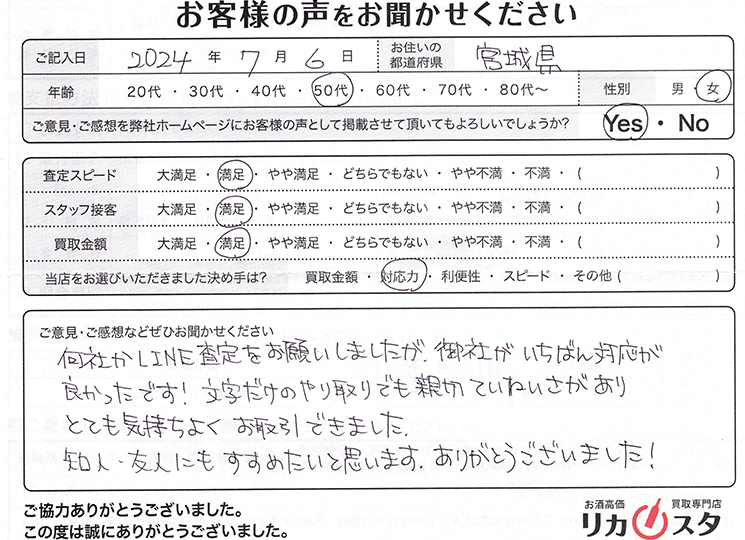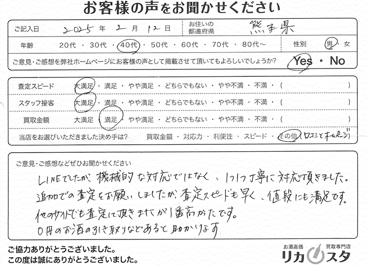 お客様コメント 初めてのお酒の買取依頼で不安でしたが、LINEより簡単に見積りが出せ、尚かつ返信までにも時間がかからず、他会社では「その他~〇 […]