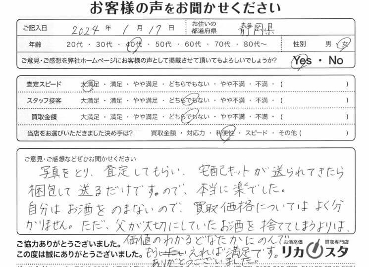 お客様コメント 家に眠っているお酒を買い取って頂き有難うございました。 宅配キットも敏速に送って頂き、対応の良さに感謝いたします。 […]