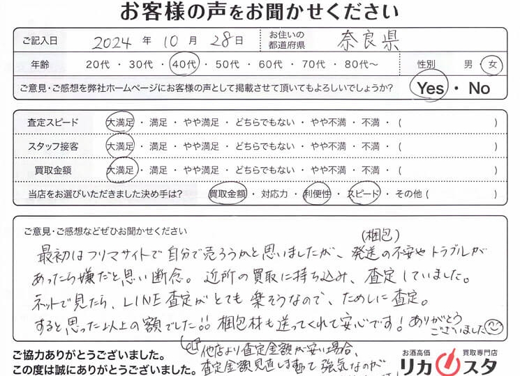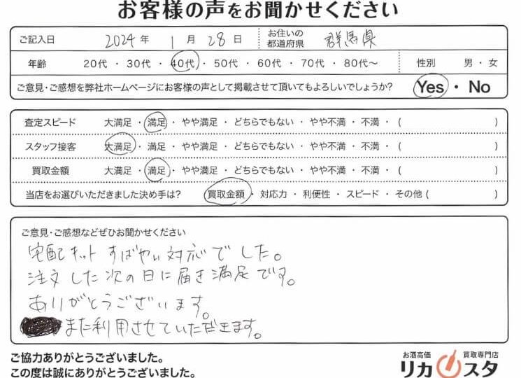 お客様コメント LINE査定の結果の早さ、金額も未開栓の物は値段つけてもらえた。LINEのやり取りのスタッフの方の丁寧な返信、宅配キットも安心して送れる中身 […]