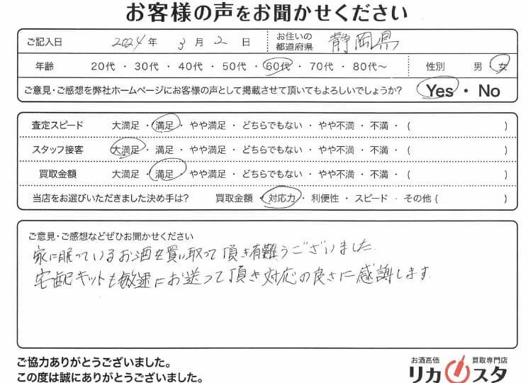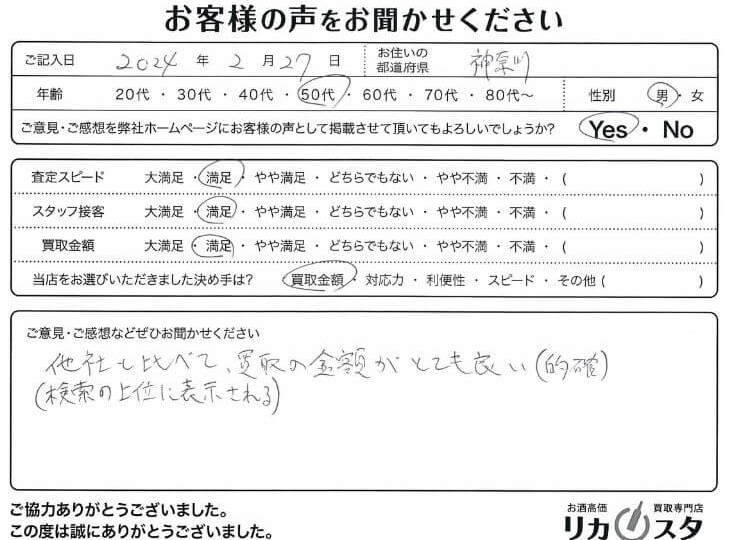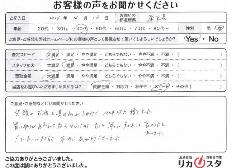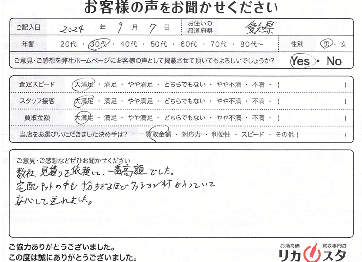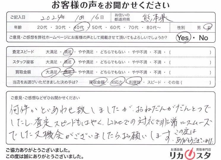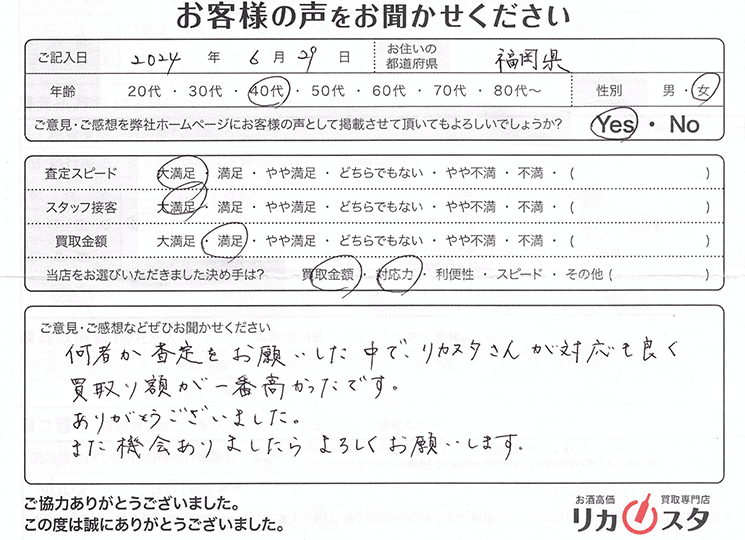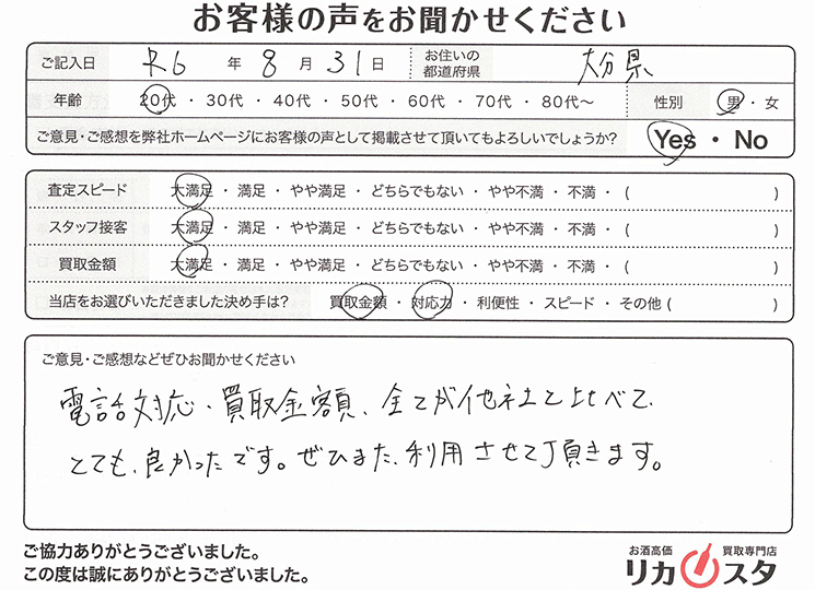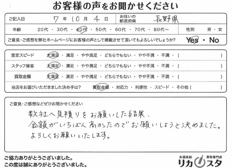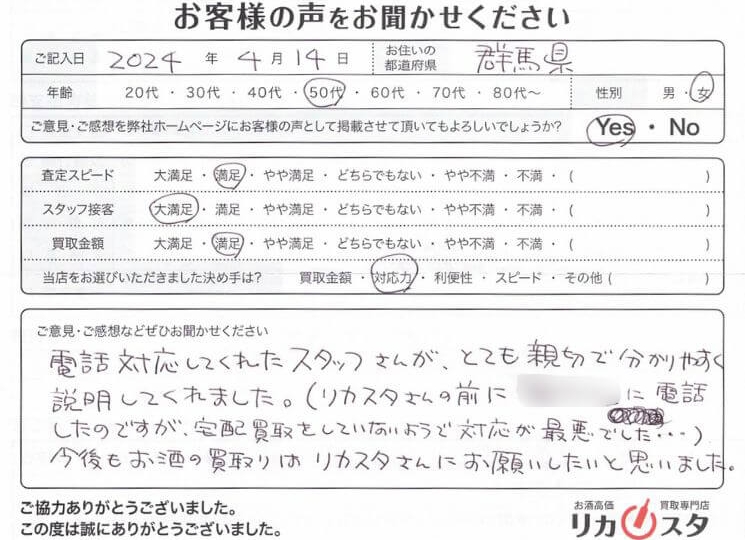 お客様コメント 納得のいく金額で買い取っていただきありがとうございました。 まだ自宅にコレクションのお酒がありますのでまた利用します。 […]
