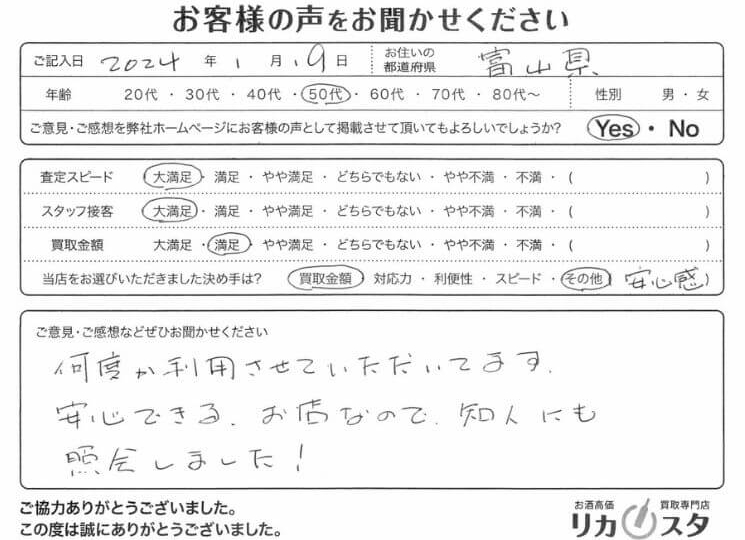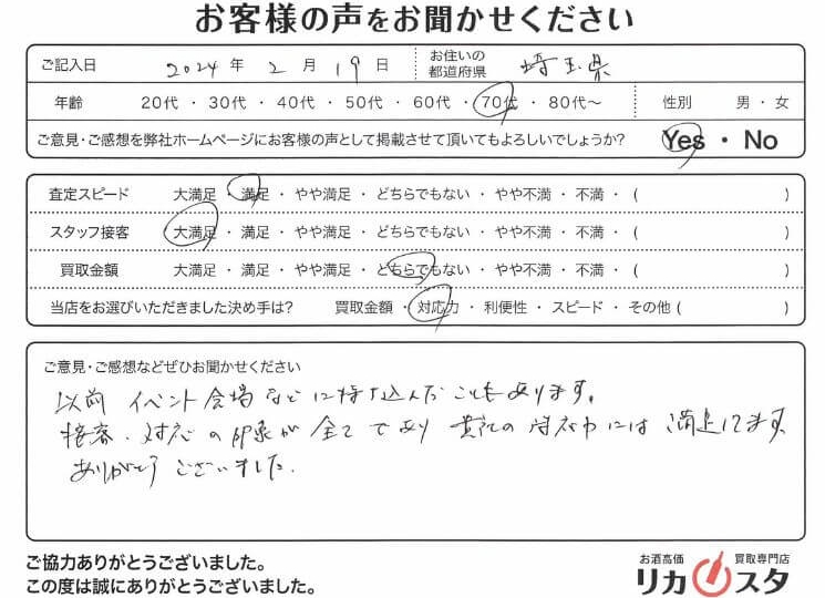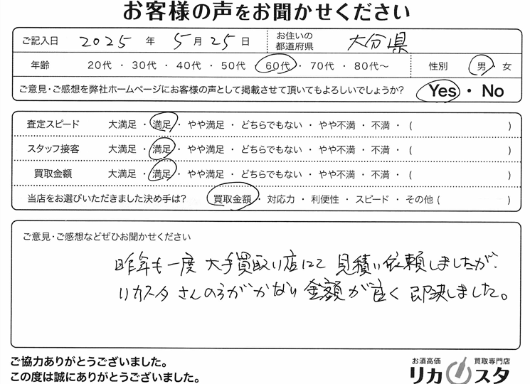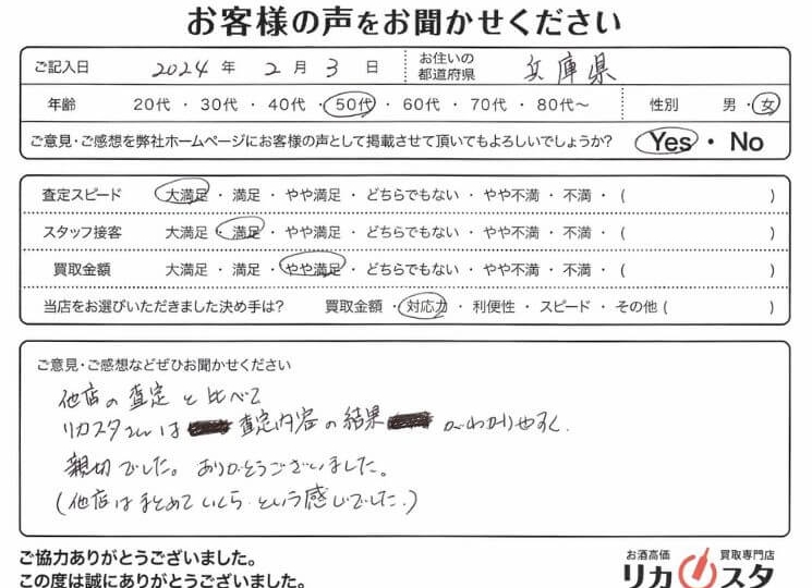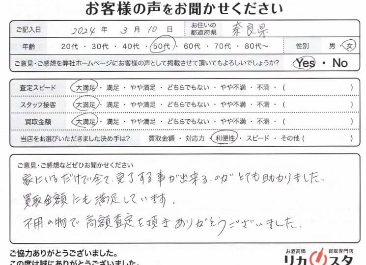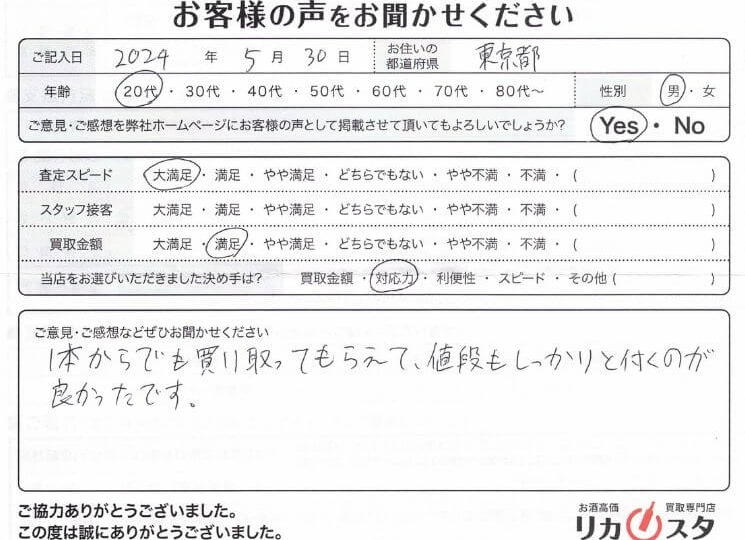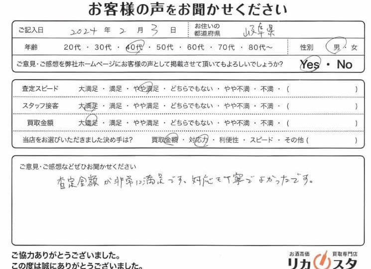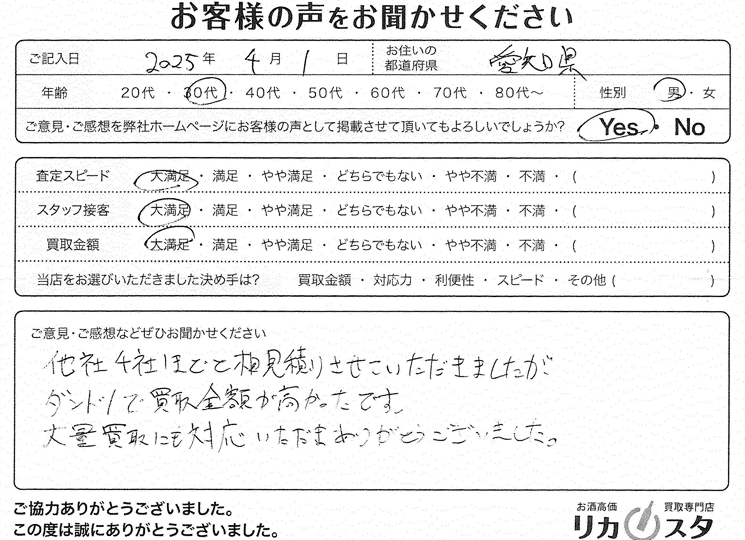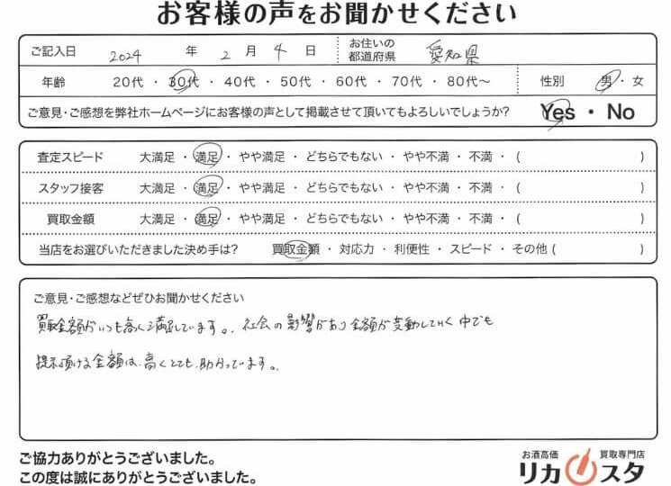お客様コメント 納得のいく金額で買い取っていただきありがとうございました。 まだ自宅にコレクションのお酒がありますのでまた利用します。 […]