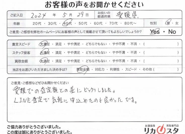 お客様コメント LINEで気軽に査定してもらえたのが良かったです。当日中に見積書を送っていただいたスピード感と丁寧な対応、金額、全てが好印象でした。 […]