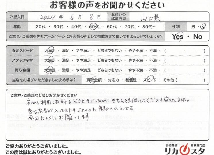 お客様コメント 山口県は田舎なので、酒の良さを分かってもらえる買取店がなく、困っていたところ、御社を知り査定をLINEでお願いしたところ(何回にも分けてお願 […]