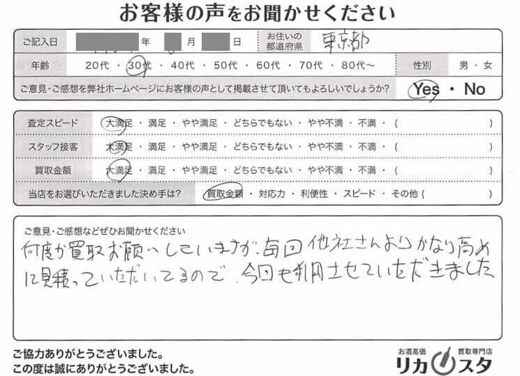 お客様コメント いつも査定が早く。他店対比での上乗せにも快く応じていただけるのでありがたいです。 また利用させていただきます。 […]