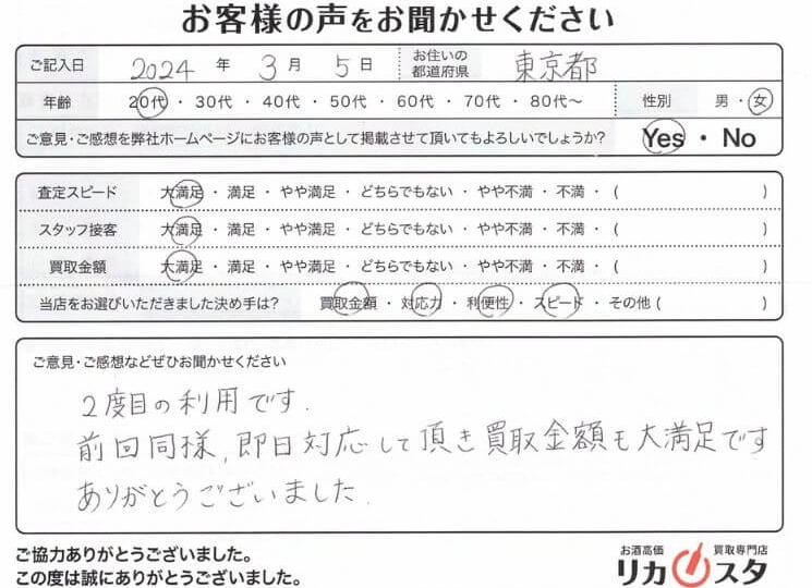 お客様コメント 2度目の利用です。 前回同様、即日対応して頂き買取金額も満足です。 ありがとうございました。 […]