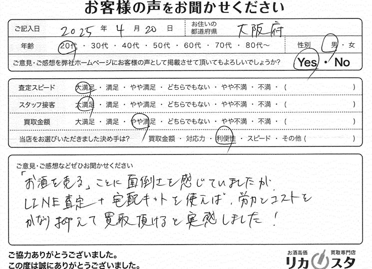 お客様コメント 「お酒を売る」ことに面倒さを感じていましたが、LINE査定+宅配キットを使えば、労力とコストをかなり抑えて買取いただけると実感しました! ─ […]