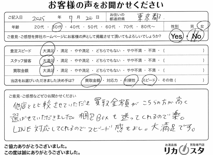 お客様コメント 他店より高く買取りしていただきました。またお願いしたいと思います。宅配キットもわかりやすいと思います。 […]