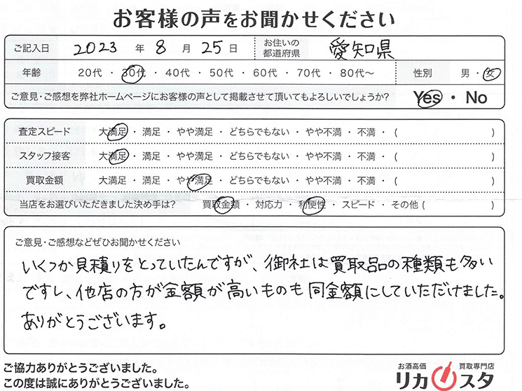 いくつか見積りをとっていたんですが、御社は買取品の種類も多いですし、
