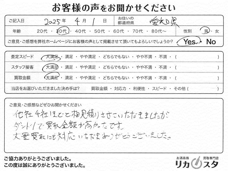 他社4社ほどと相見積もりさせていただきましたが、ダントツで買取金額が高かったです。