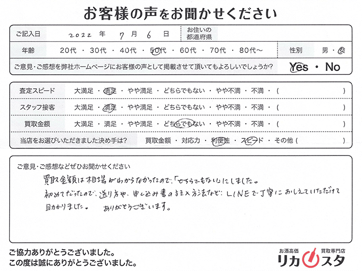 初めてだったので、送り方や申込書の記入方法など、LINEで丁寧に教えていただけて助かりました。ありがとうございます。