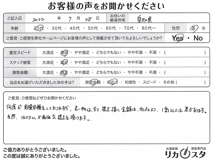 スタッフの対応等にご満足いただけていること、またお客様のご納得いただける金額での買取をさせていただけていたようで、大変嬉しく思います。
