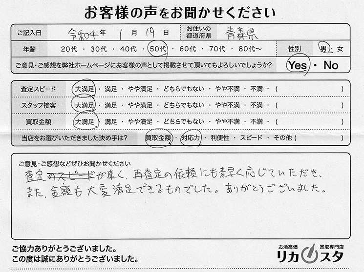 査定が速く、再査定の依頼にも素早く応じていただき、また金額も大変満足できるものでした。ありがとうございました。
