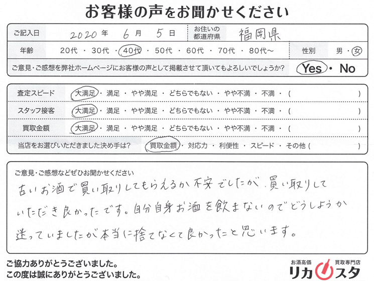 古いお酒で買い取りしてもらえるか不安でしたが、買い取りしていただき良かったです。