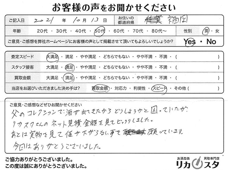 父のコレクションで酒が出てきたからどうしようかと困っていたが、リカスタさんのネット見積金額を見てビックリしました。