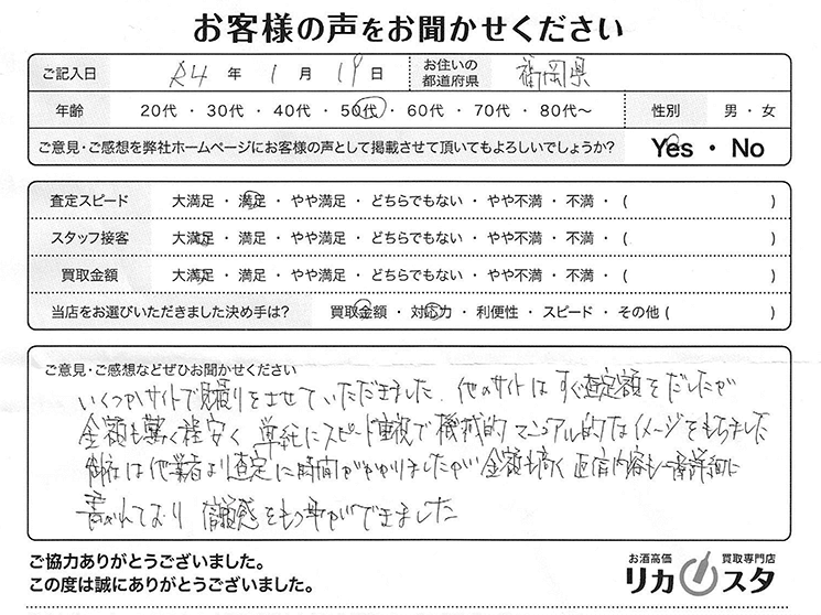 御社は他業者より査定に時間がかかりましたが、金額も高く返信内容も一番詳細に書かれており信頼感をもつ事ができました。