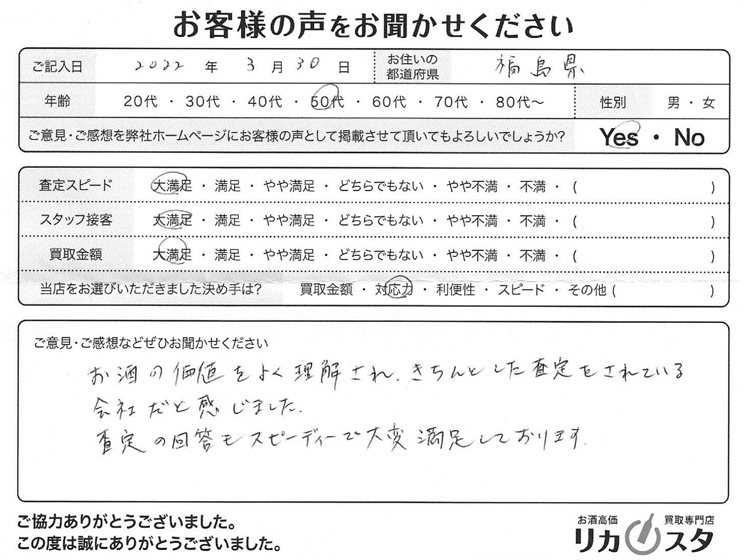 お酒の価値をよく理解され、きちんとした査定をされている会社だと感じました。