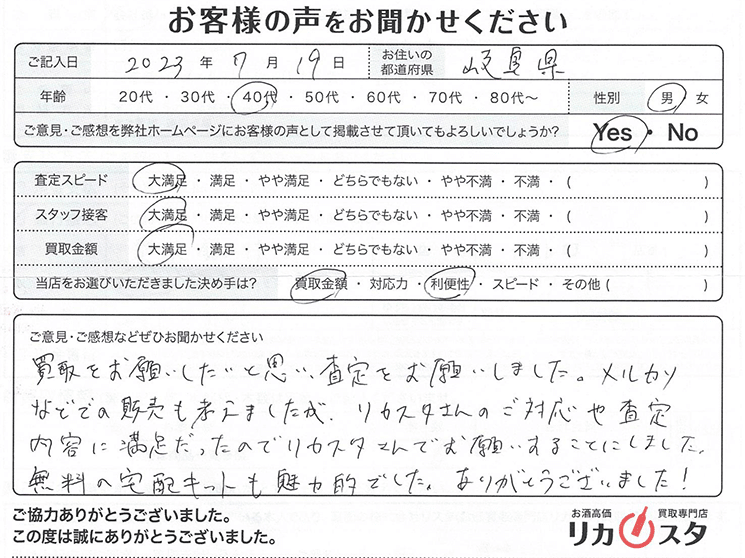 メルカリなどでの販売も考えましたが、リカスタさんのご対応や査定内容に