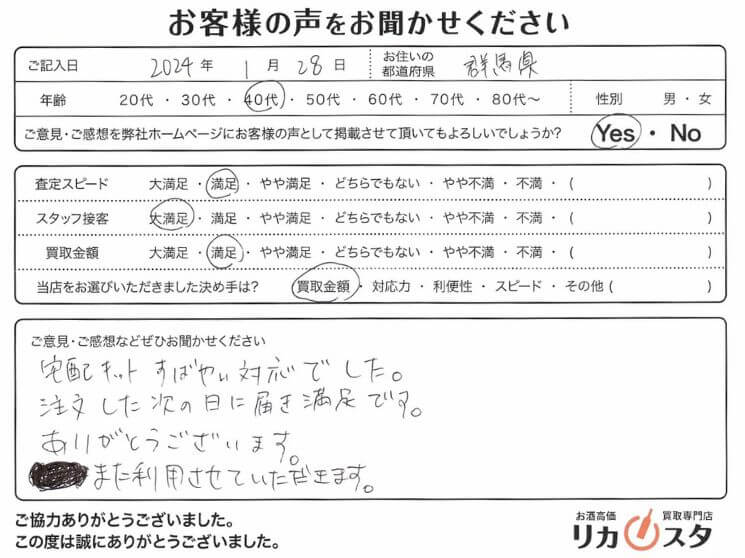 当店の宅配キットのスピーディーな対応に、ご満足いただけたご様子で大変嬉しく思います!
