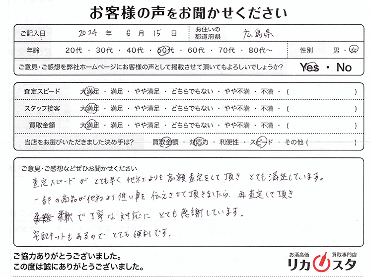 査定スピードがとても早く、他社よりも高額査定をして頂きとても満足しています。