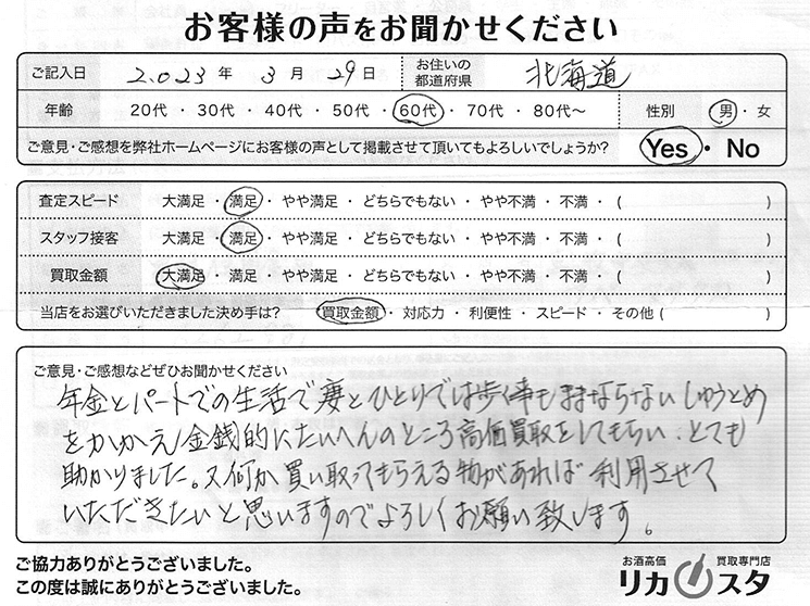 買取金額に関しまして、ご満足いただけたご様子で私共も大変嬉しく思います。