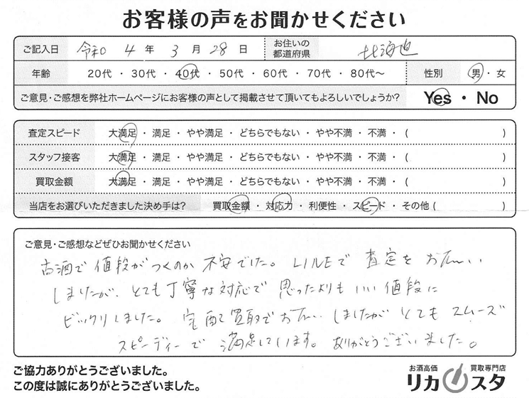 古酒で値段がつくのか不安でした。LINEで査定をお願いしましたが、とても丁寧な対応で思ったよりもいい値段にビックリしました。