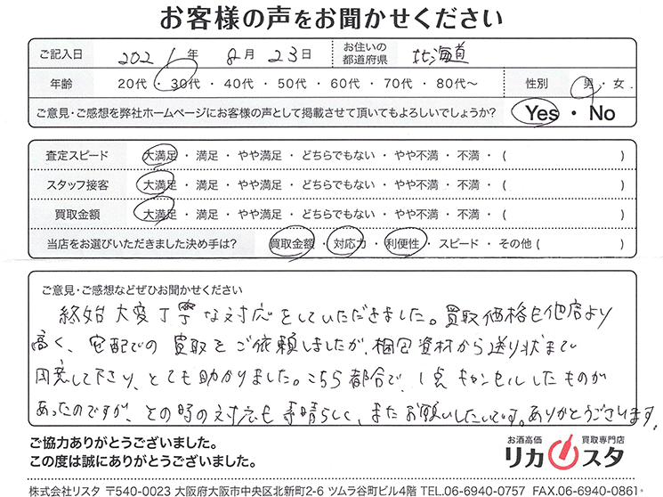 今回のお客様は、北海道から宅配キットコースでお取引させていただきました。