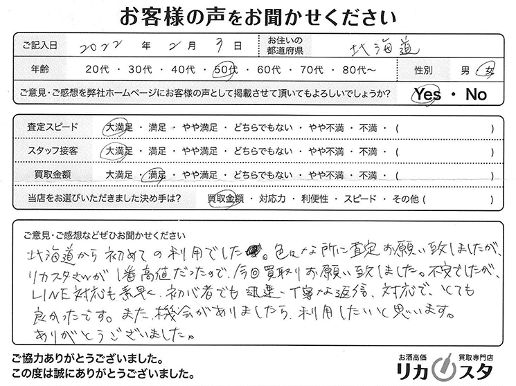 北海道から初めての利用でした。色々な所に査定をお願いいたしましたが、リカスタが1番高値だったので、今回買取をお願いいたしました。