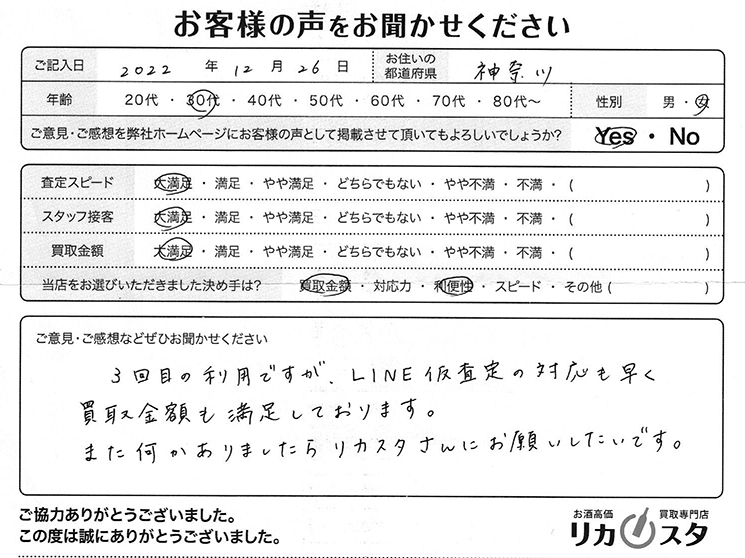3回目の利用ですが、LINE仮査定の対応も早く、買取金額も満足しております。