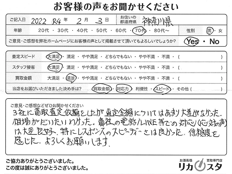 貴社の電話/LINE等での対応(応対の声)は大変良好。特にレスポンスのスピーディーさは良かった。信頼度を感じた。よろしくお願いします。