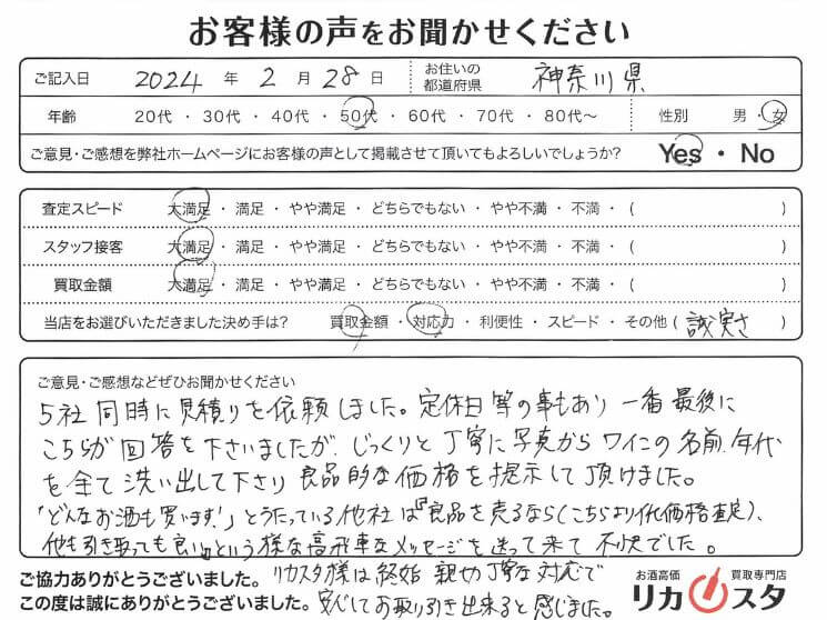 5社同時に見積りを依頼しました。定休日等の事もあり一番最後にこちらが回答を下さいましたが、じっくりと丁寧に写真からワインの名前・年代を全て洗い出して下さり、良品的な価格を提示して頂けました。