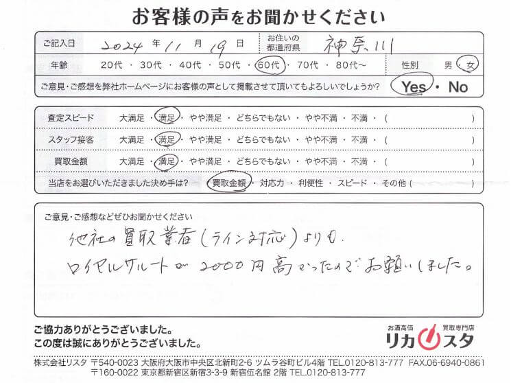 他社の買取業者(ライン対応)よりも、ロイヤルサルートが2,000円高かったのでお願いしました。