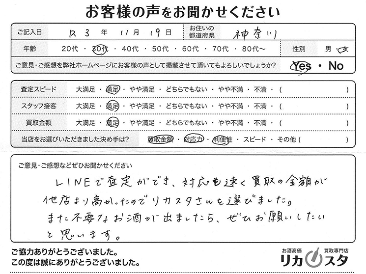 LINEで査定ができ、対応も速く買取の金額が他店より高かったのでリカスタさんを選びました。また不要なお酒が出ましたら、ぜひお願いしたいと思います。