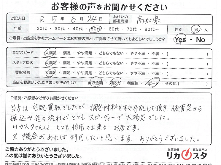 当方は宅配買取でしたが、梱包材料をすぐ手配して頂き、