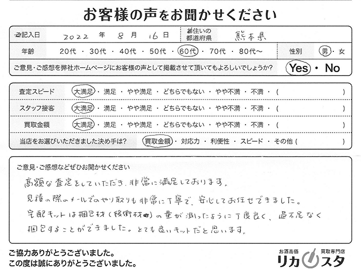 高額な査定をしていただき、非常に満足しております。