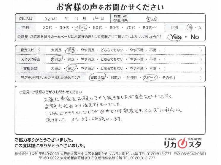 大量に査定をお願いさせていただきましたが査定スピードも早く、金額も他社より満足するものでした。