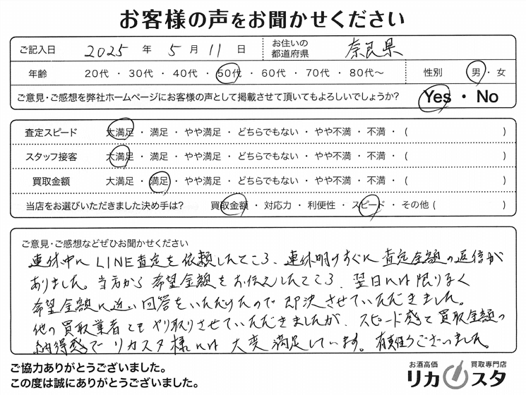 スピード感と買取金額にご納得いただけ、大変嬉しく思います。