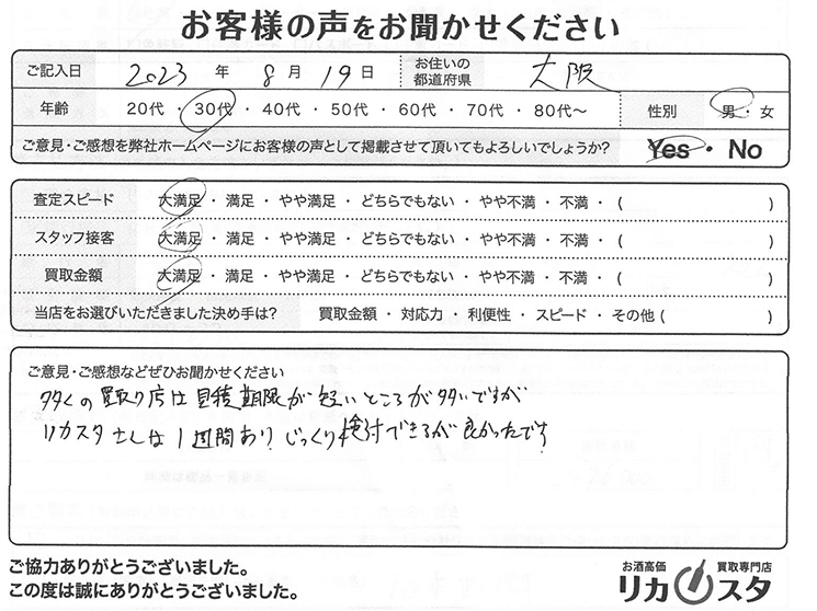 多くの買取店は見積期限が短いところが多いですが、リカスタさんは1週間あり、じっくり検討できるのが良かったです。