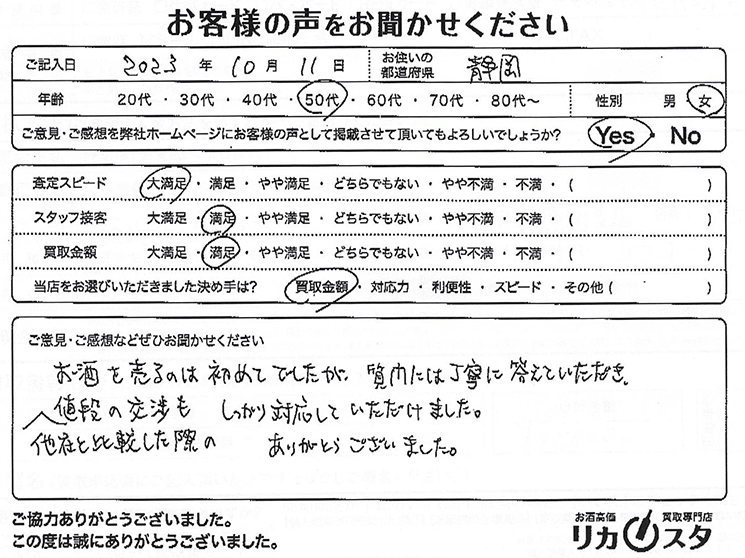 お酒を売るのは初めてでしたが、質問には丁寧に答えていただき、他社と比較した際の値段の交渉もしっかり対応していただけました。