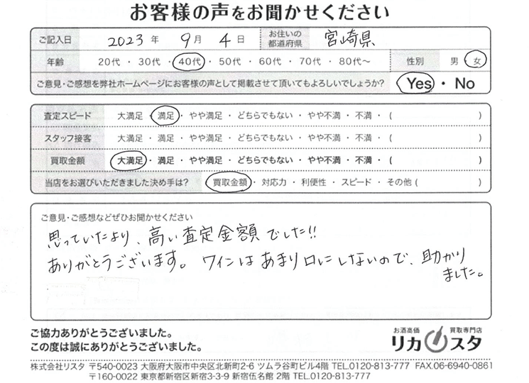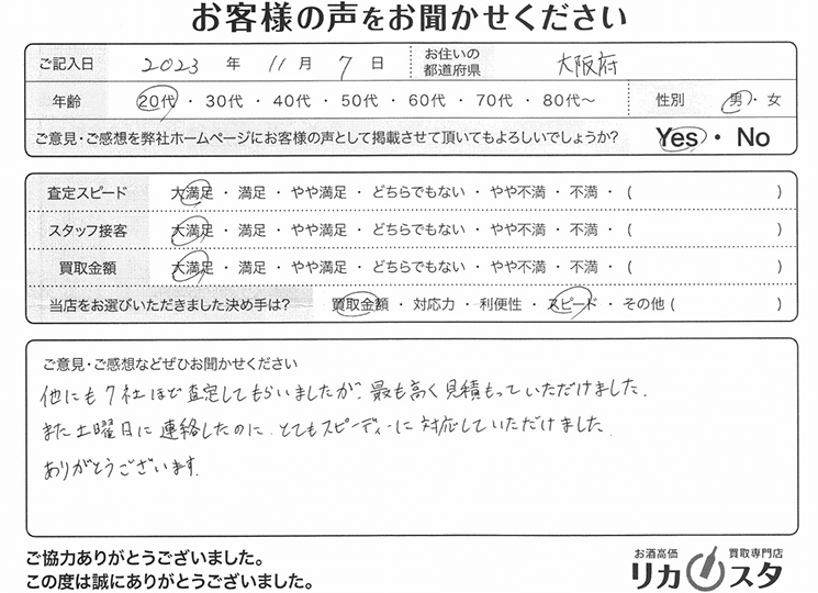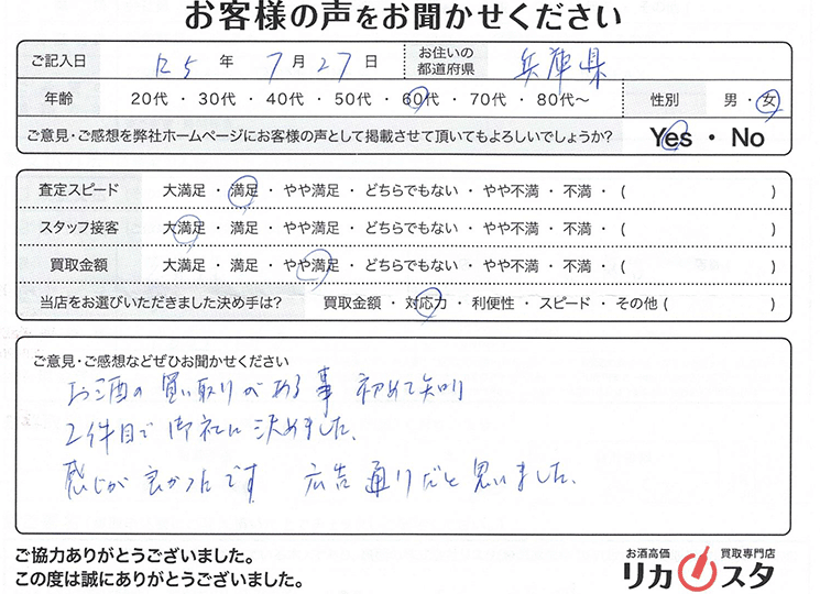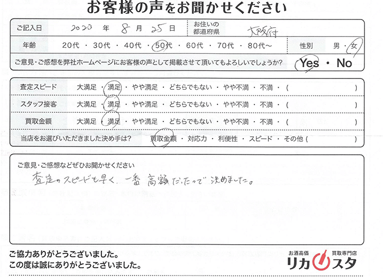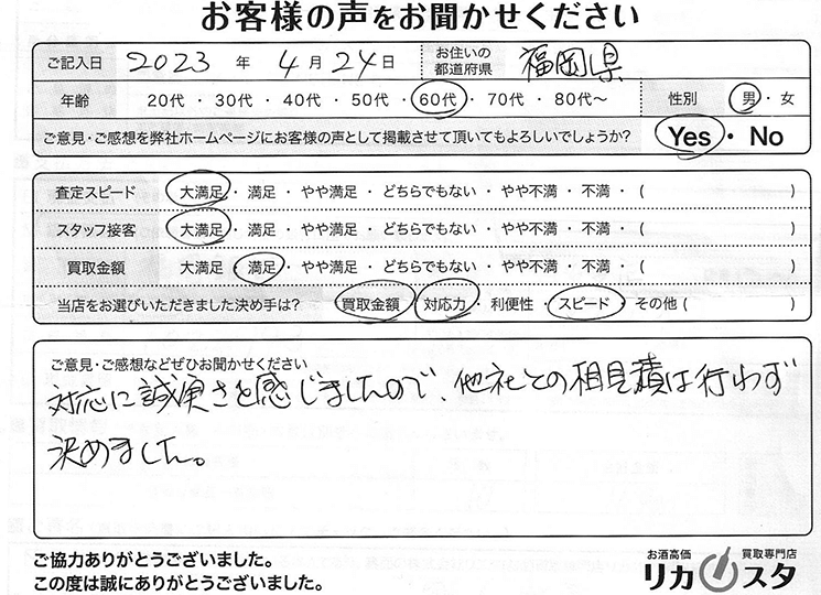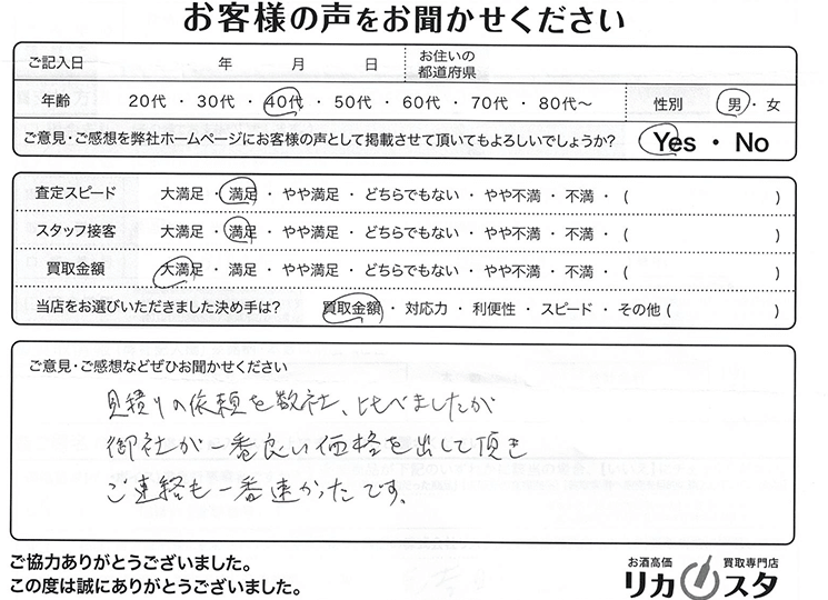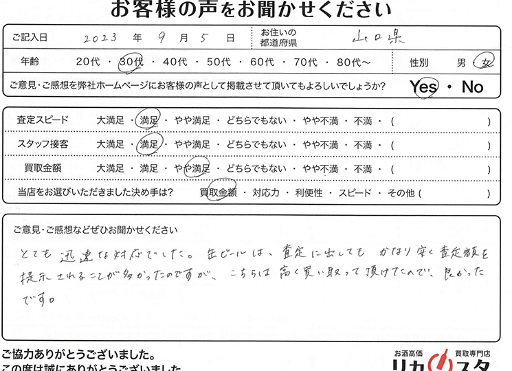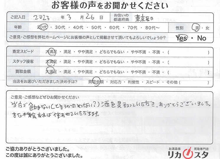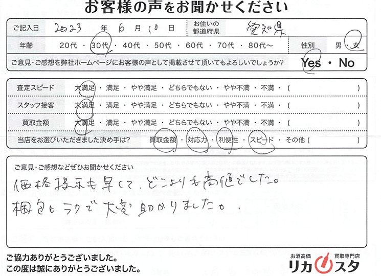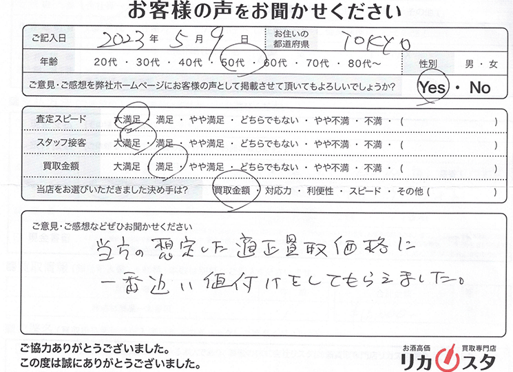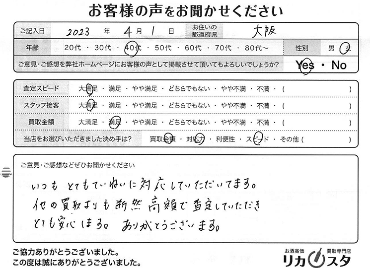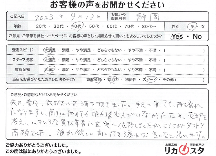 お客様コメント お酒を売るのは初めてでしたが、質問には丁寧に答えていただき、他社と比較した際の値段の交渉もしっかり対応していただけました。 あ […]