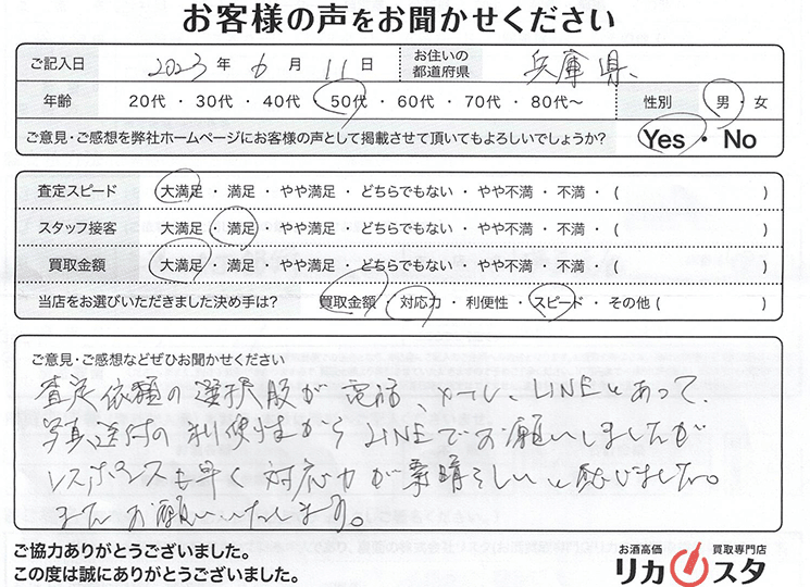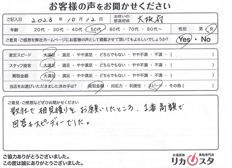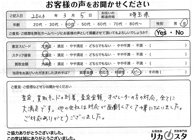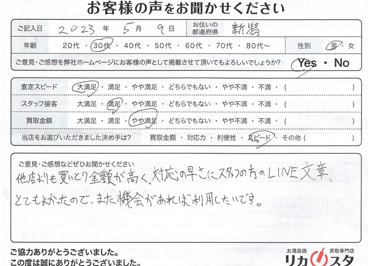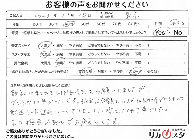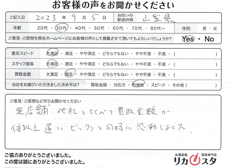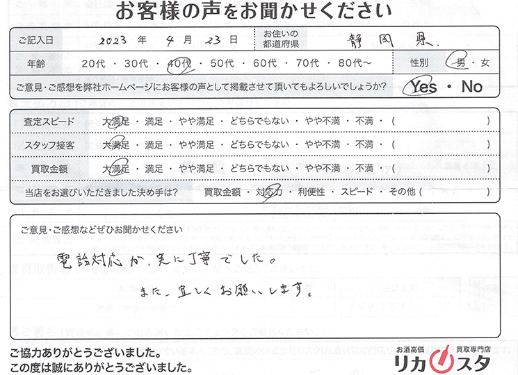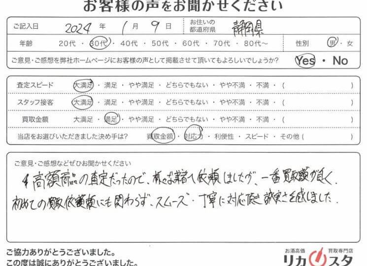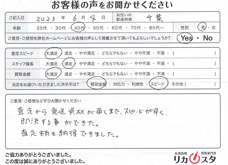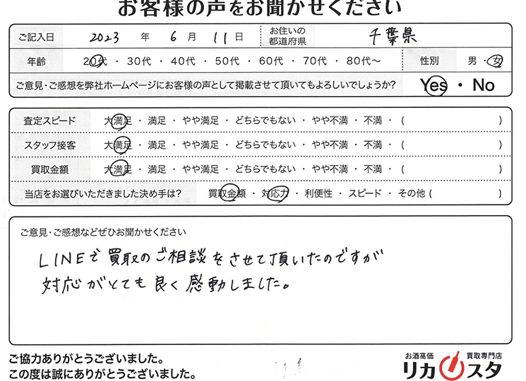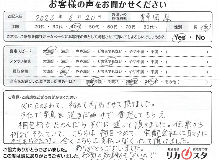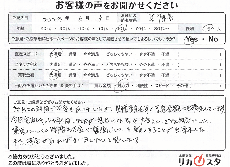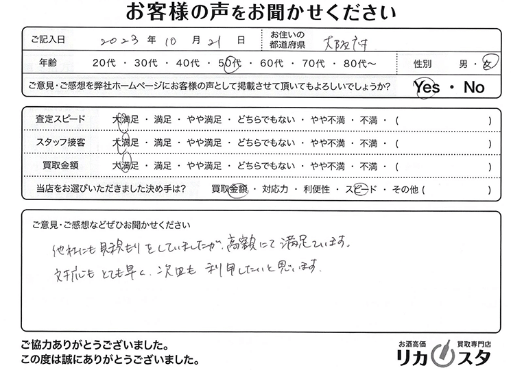 お客様コメント お酒を売るのは初めてでしたが、質問には丁寧に答えていただき、他社と比較した際の値段の交渉もしっかり対応していただけました。 あ […]