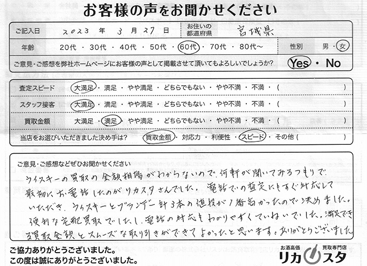 お客様コメント 近くにお酒の買取があまりなく、実家の父の飲まない洋酒を売りたく こちらにお願いしました。 迅速に査定下さり、対応も丁寧で安心しました。 ── […]