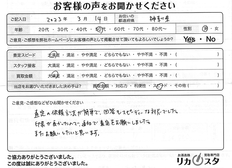 お客様コメント 査定の依頼方法が簡単で、回答もスピーディーな対応でした。 印象が良かったので、追加で査定をお願いしました。 またお願いしたいと思います。 ─ […]