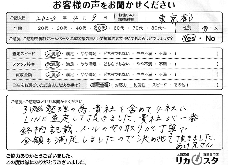 お客様コメント 引越整理の為、貴社を含めて4社にLINE査定して頂きました。 貴社が一番、銘柄記載、メールのやり取りが丁寧で 金額も満足しまし […]