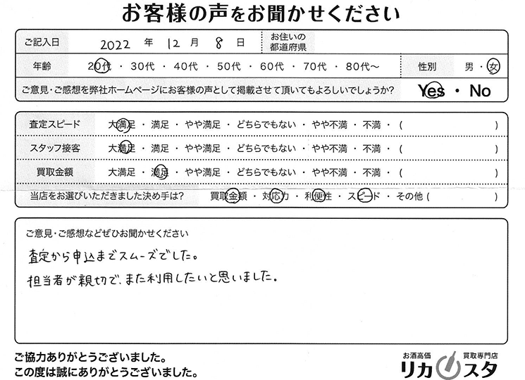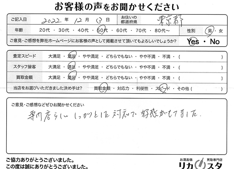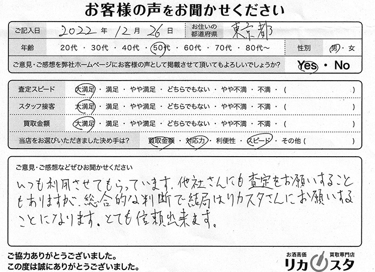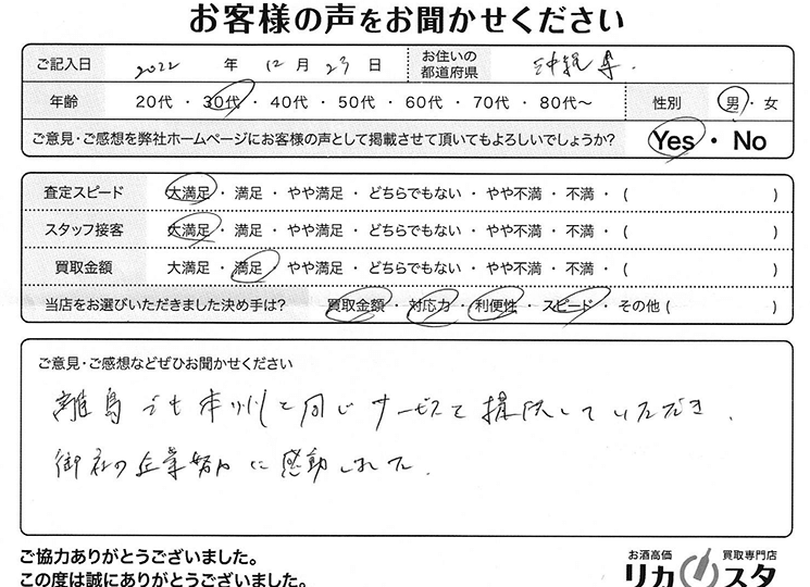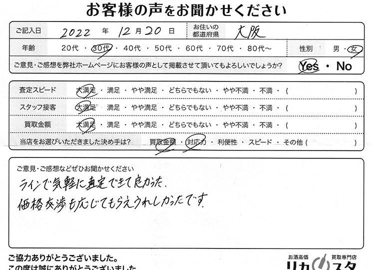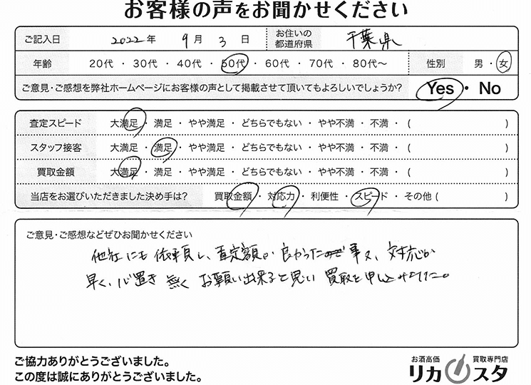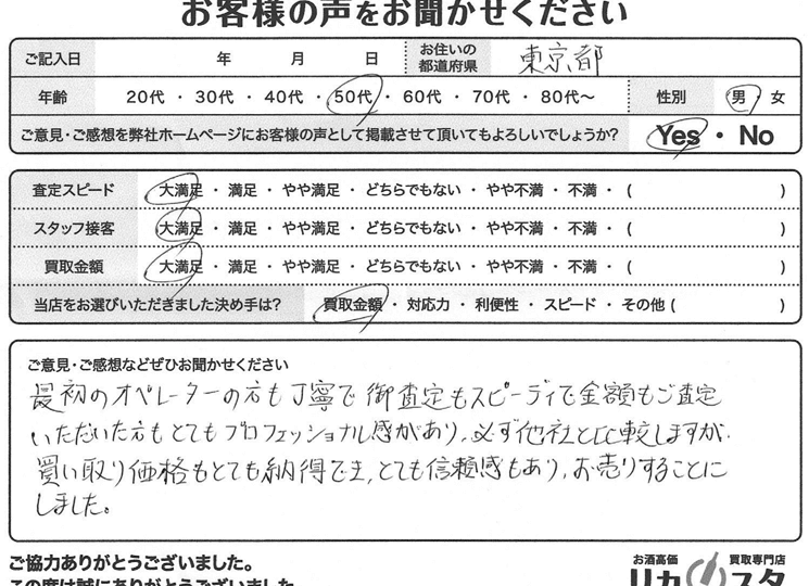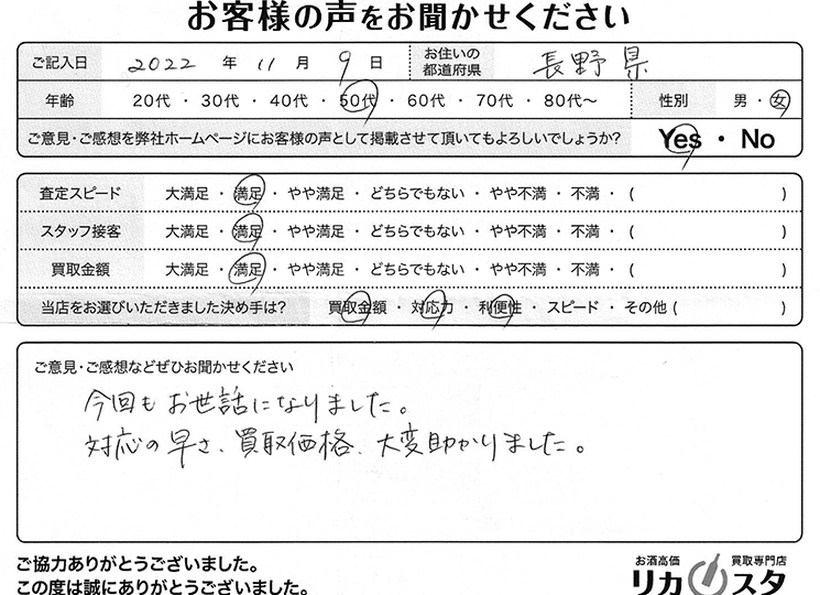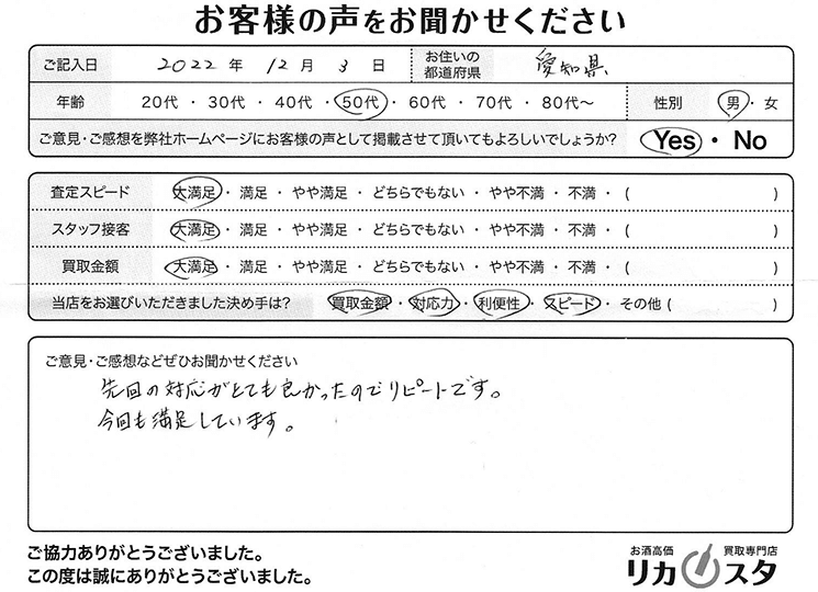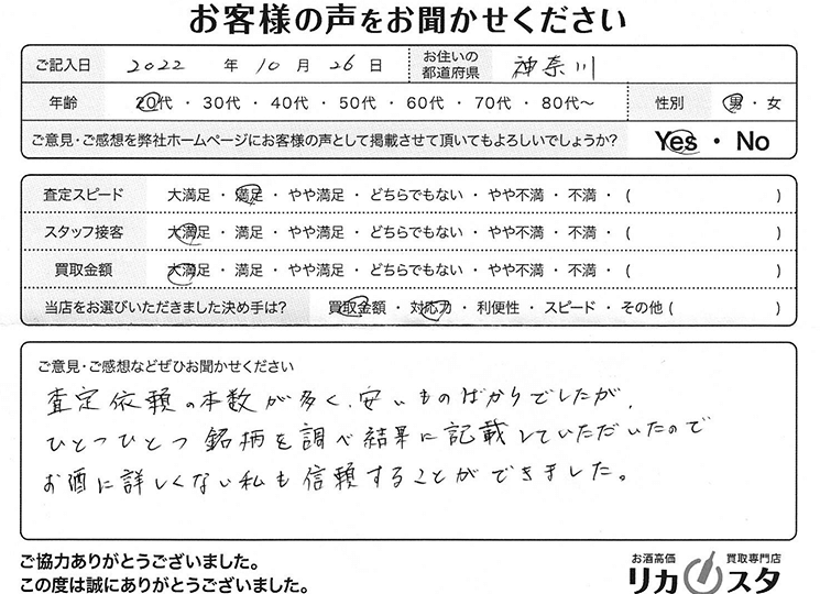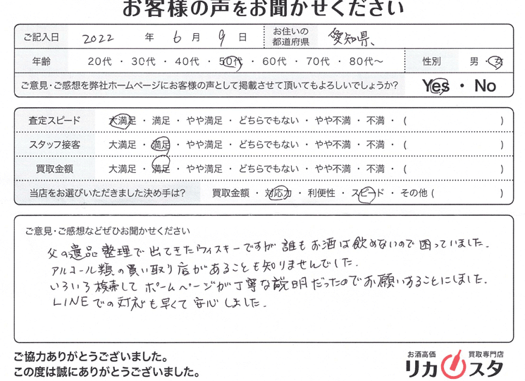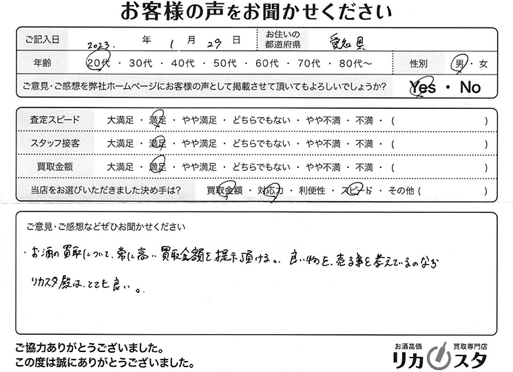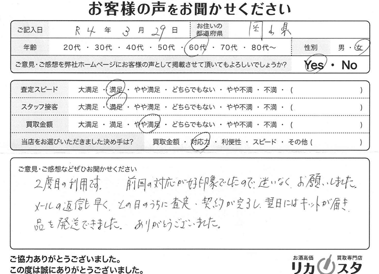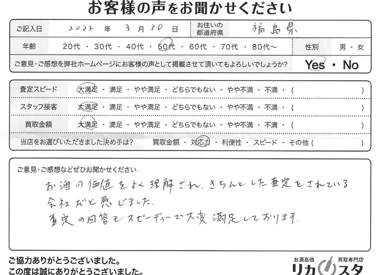 お客様コメント お酒の価値をよく理解され、きちんとした査定をされている会社だと感じました。 査定の回答もスピーディーで大変満足しております。 […]