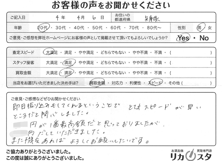 お客様コメント 少しでも高く買って頂きたい希望にお答えいただきうれしく思いました。 即入金頂けることにも満足いたしました。 […]